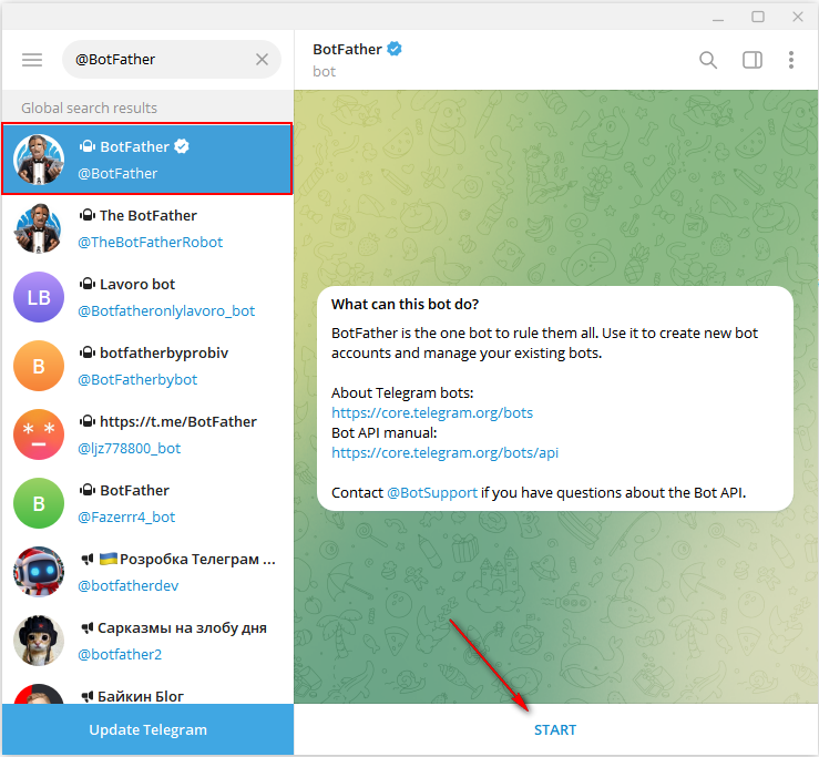 Search the @BotFather bot and start a new conversation: