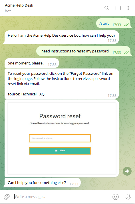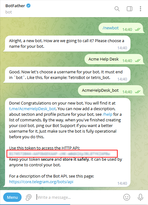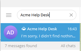 where the <bot_username> is the one you’ve chosen ant Step 1, e.g. https://t.me/AcmeHelpDesk_bot