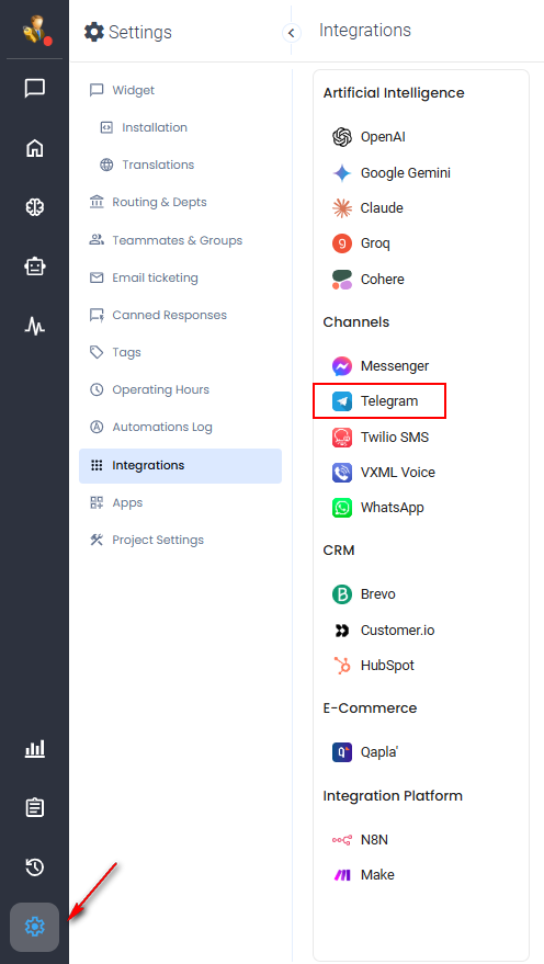 On the leftside menu select Settings > Integrations > Telegram: