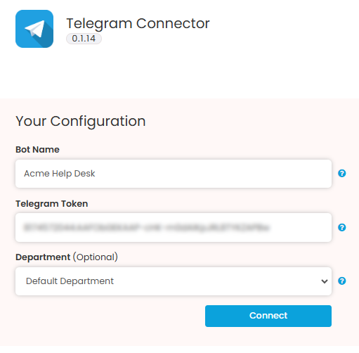 Enter the Bot name (‘Acme Help Desk’ in our example above) and the token previously returned by BotFather. Also, select the department that will be triggered on new incoming conversations. Then press Connect: